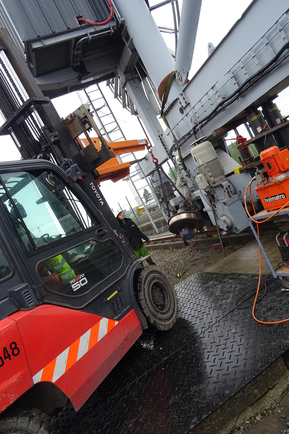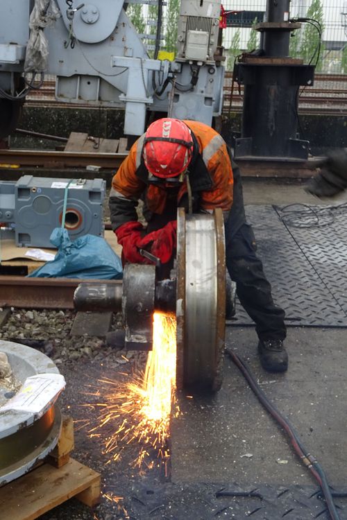 Na een defect aan de tandwielkast kon dekraan niet meer rijden. Om de productie toch draaiende te houden, liet de klantde as tussen de tandwielkast en het wiel tijdelijk afbranden. In een laterefase hebben wij het geheel structureel hersteld: